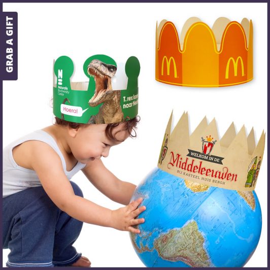 Grab a Gift is leverancier van hoogwaardige bedrukte kartonnen kroontjes met een slim sluitsysteem voor de perfecte pasvorm. Onze kracht ligt in het bedrukken van deze kroontjes met jouw eigen logo of ontwerp. Met maar liefst 9 verschillende modellen bieden we een scala aan mogelijkheden om jouw merk of boodschap op een opvallende manier te presenteren!