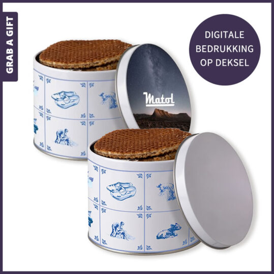 Nederland op z’n best! Verras jouw klanten met een origineel Delftsblauw stroopwafelblik, bedrukt met jouw logo of ontwerp in full colour op het deksel. Het blik is gevuld met acht heerlijke roomboter stroopwafels – een typisch Hollandse lekkernij die altijd in de smaak valt. Een stijlvol en smaakvol relatiegeschenk dat perfect past bij elk bedrijfsmoment.