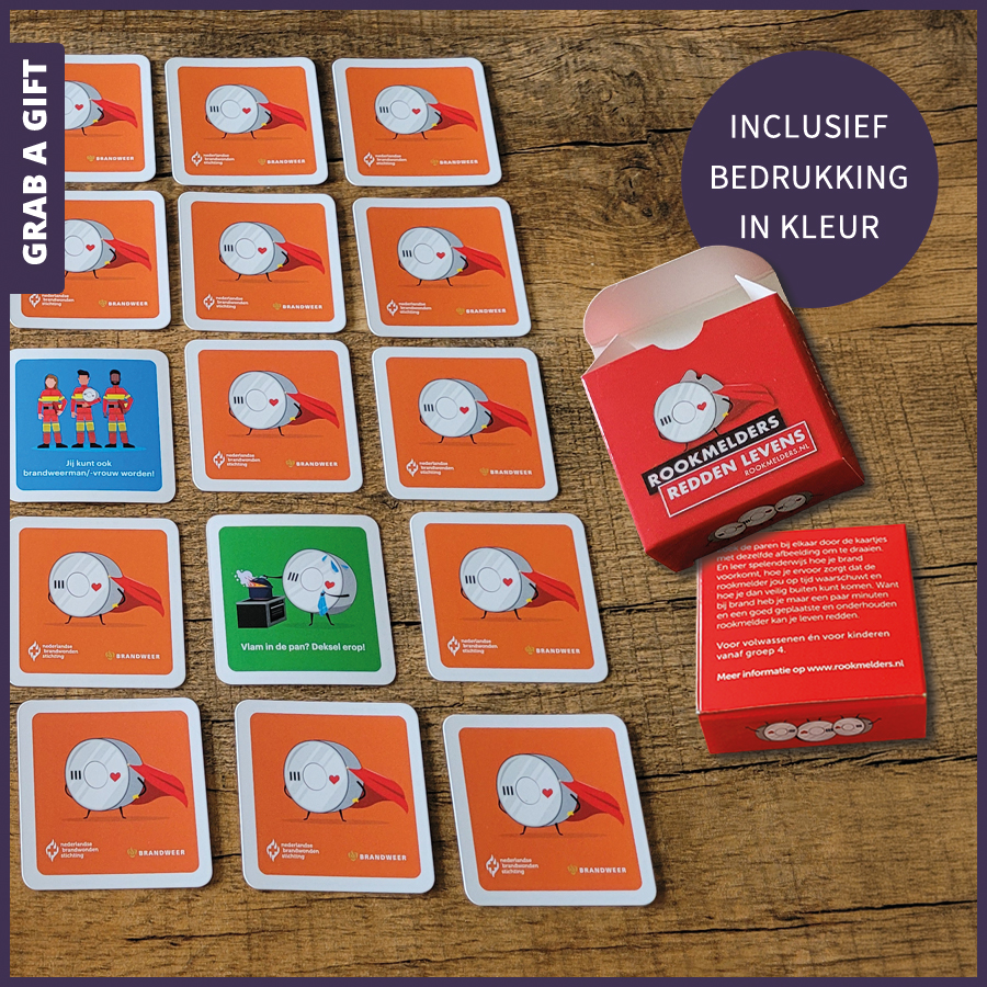 Laat een gepersonaliseerd geheugenspel bedrukken met jouw eigen ontwerp voor een speels en blijvend relatiegeschenk. Grab a Gift levert full-colour bedrukte speelkaartjes in een gelamineerd vouwdoosje. Kies uit een set met 30 of 48 kaartjes (15 of 24 paren), waarbij zowel de rug- als de speelzijde volledig naar wens bedrukt wordt met logo’s, illustraties of andere ontwerpen.