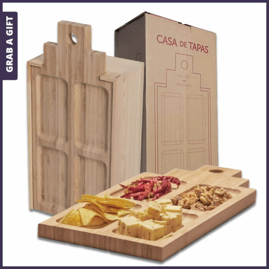 Rackpack model Casa de Tapas Large is een houten wijnkist voor twee flessen wijn, of één fles wijn en enkele heerlijke tapas. De voorkant van het bamboe bord heeft 4 vakjes voor het serveren van de verschillende tapas en de achterkant kan gebruikt worden als snijplank. Muchas gracias!