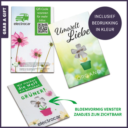 De wenskaart wordt volledig naar wens bedrukt met jouw logo, campagne of reclameboodschap. Ontwerp je eigen zaadkaartje met kijkvenster of vraag onze creatieve ontwerpster om hulp! Als wij het de kaart met bloemzaadjes mogen ontwerpen, hoef je alleen maar je wensen door te geven, zodat we jouw ideeën vakkundig kunnen uitwerken.