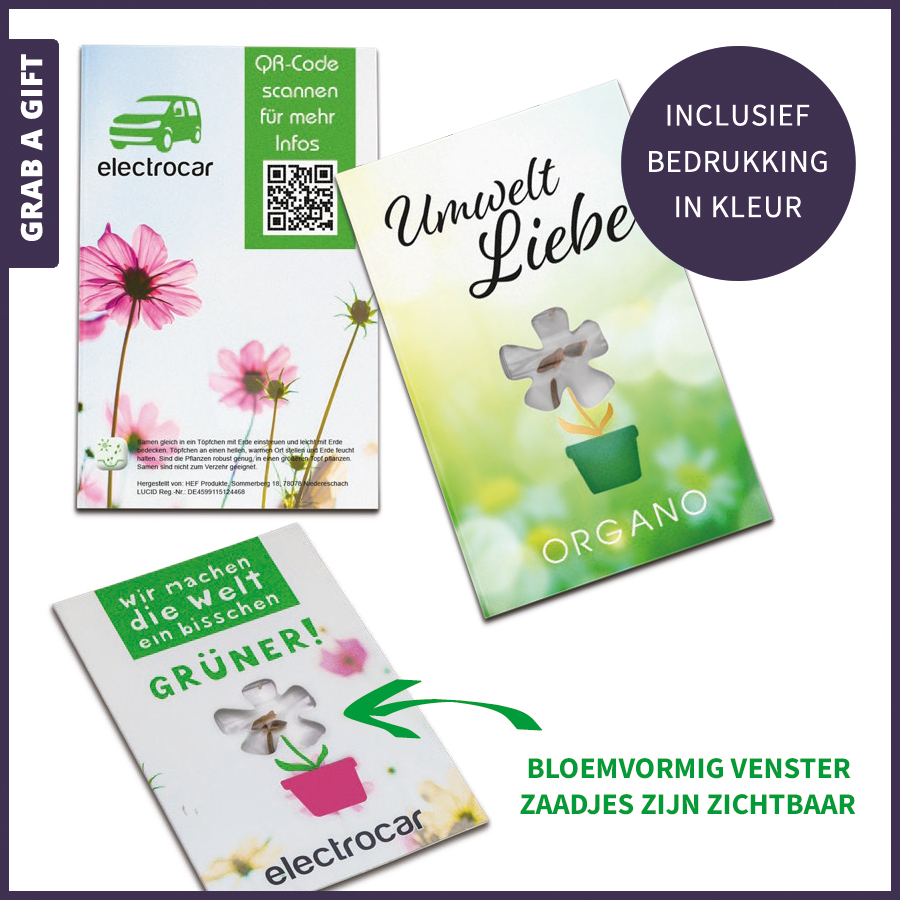 Een aantrekkelijk promotie- en mailitem waarmee de ontvanger direct ziet wat hij krijgt: een venster in de vorm van een bloem speelt speels in op het lentethema en laat de bloemzaadjes zien. Deze bewegen losjes heen en weer in het zakje en nodigen uit om te gaan tuinieren. Bestel de bedrukte zaad-kaartjes met jouw favoriete zaadjes.