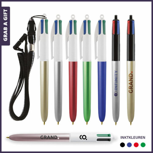 Sinds de lancering in 1970 door Marcel Bich is de BIC 4 Kleuren pen een wereldwijd icoon geworden. Met één klik wissel je eenvoudig tussen vier kleuren zonder van pen te hoeven wisselen. Deze pen, geliefd bij zowel professionals als schoolkinderen, blijft een favoriet dankzij het herkenbare design en de veelzijdigheid. Voeg een persoonlijk tintje toe met jouw eigen rondom bedrukking of logo opdruk en maak van deze klassieker een perfect relatiegeschenk.